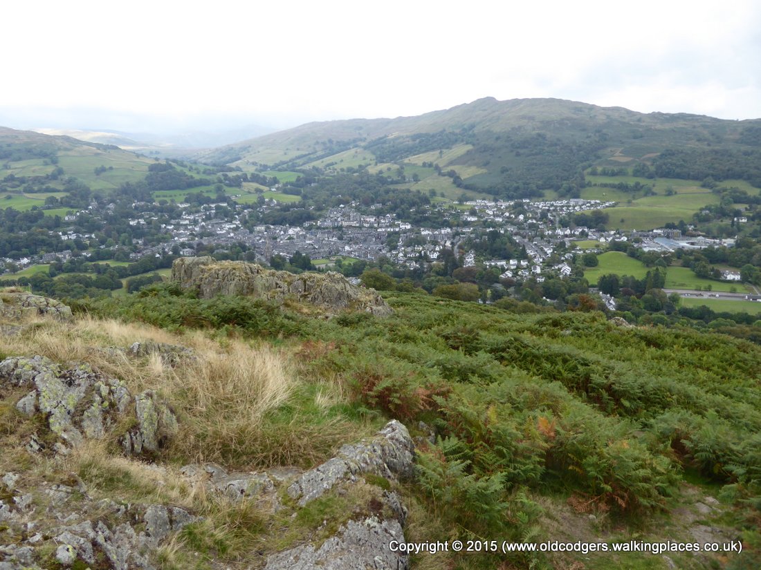 We were happy to be leaving Windermere, heading for Orrest Head. After a long climb through woods between drystone walls we emerged at the viewpoint where a printed plate of Wainwright's drawing enabled us to identify the fells we would be walking over today and next week, even though the view was hazy under a grey sky.