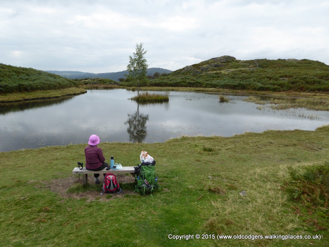 It was a steep climb (again) up the flank of Loughrigg Fell. Part way up the track to Lilly Tarn we detoured onto a minor track to the south that we hoped would take us to the viewpoint over Ambleside and Windermere. The views from many points along the paths were wonderful. We headed back over a ridge to Lily Tarn where a woman was throwing sticks for her border collie to retrieve from the water. She left as we approached (did we look that bad, even in freshly laundered clothes?), so we occupied the seat for our lunch and watched a large dragonfly buzzing over the water.
