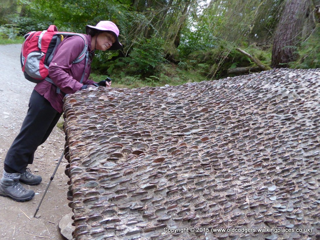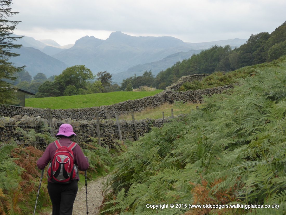 After lunch in this lovely, peaceful spot, we headed down to Skelwith Bridge passing several couples and family groups out walking. We then climbed gently to Colwith Force, passing through several farms along the way. As well as several couples with dogs, we encountered two groups of teenagers on Duke of Edinburgh Award expeditions. The path through the woods near the Force was pleasant. We passed an old fallen tree with thousands of coins hammered into the trunk – a wishing tree. We emerged from the woods to see High Park Farm in a magnificent setting surrounded by high peaks and overlooking Langdale.