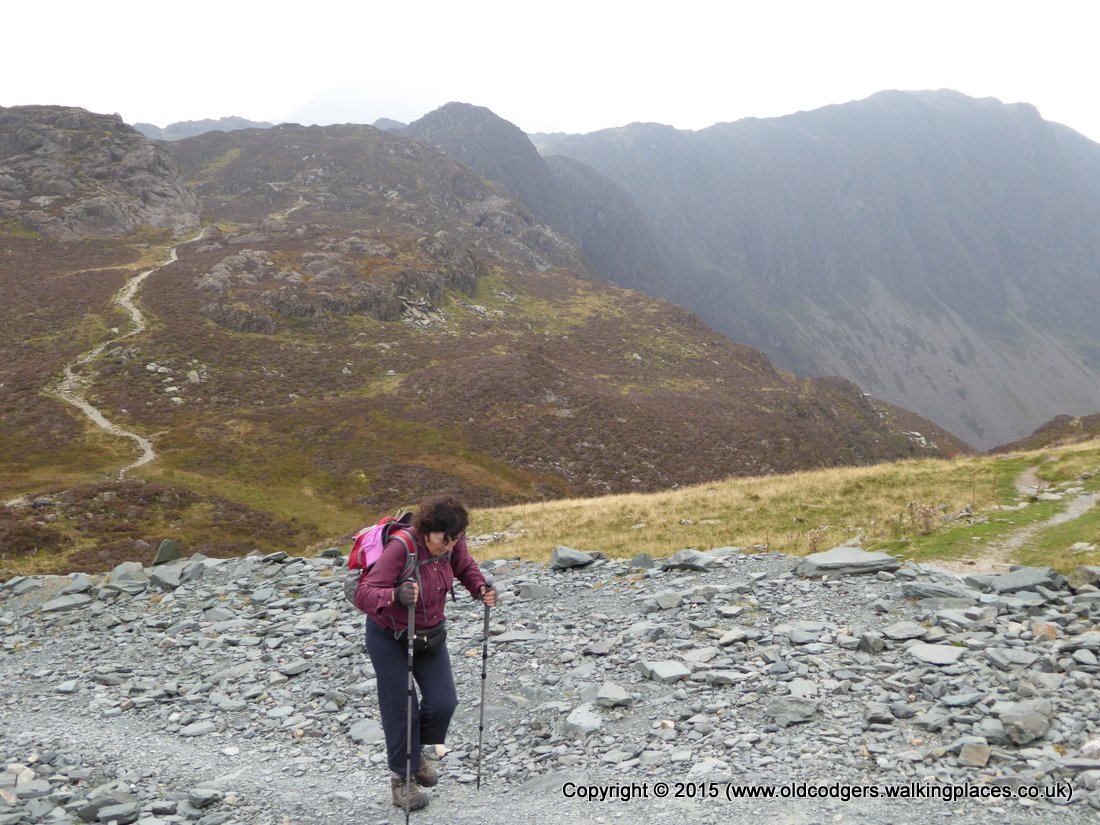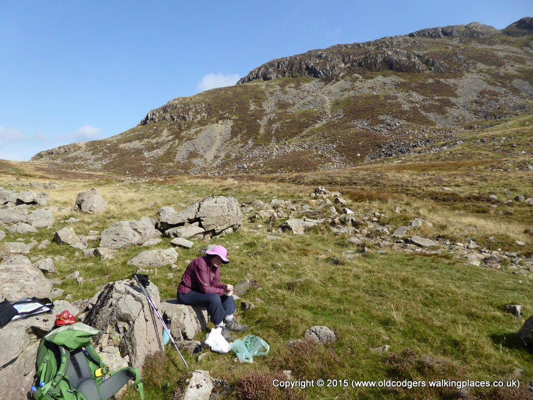With Black Sail Hut in sight we turned up the path to Scarth Gap. We stopped at the Gap at 1.15 for lunch and were passed by another group of DoE walkers. We gazed up at the rocky outcrops of Haystacks that had almost stopped Mary in 2010. Mary was determined to conquer Haystacks this time. We watched a large group of walkers concertina at the steep section that Mary had found difficult. This time Mary scrambled up the steep section unaided, and she was very proud of her achievement.