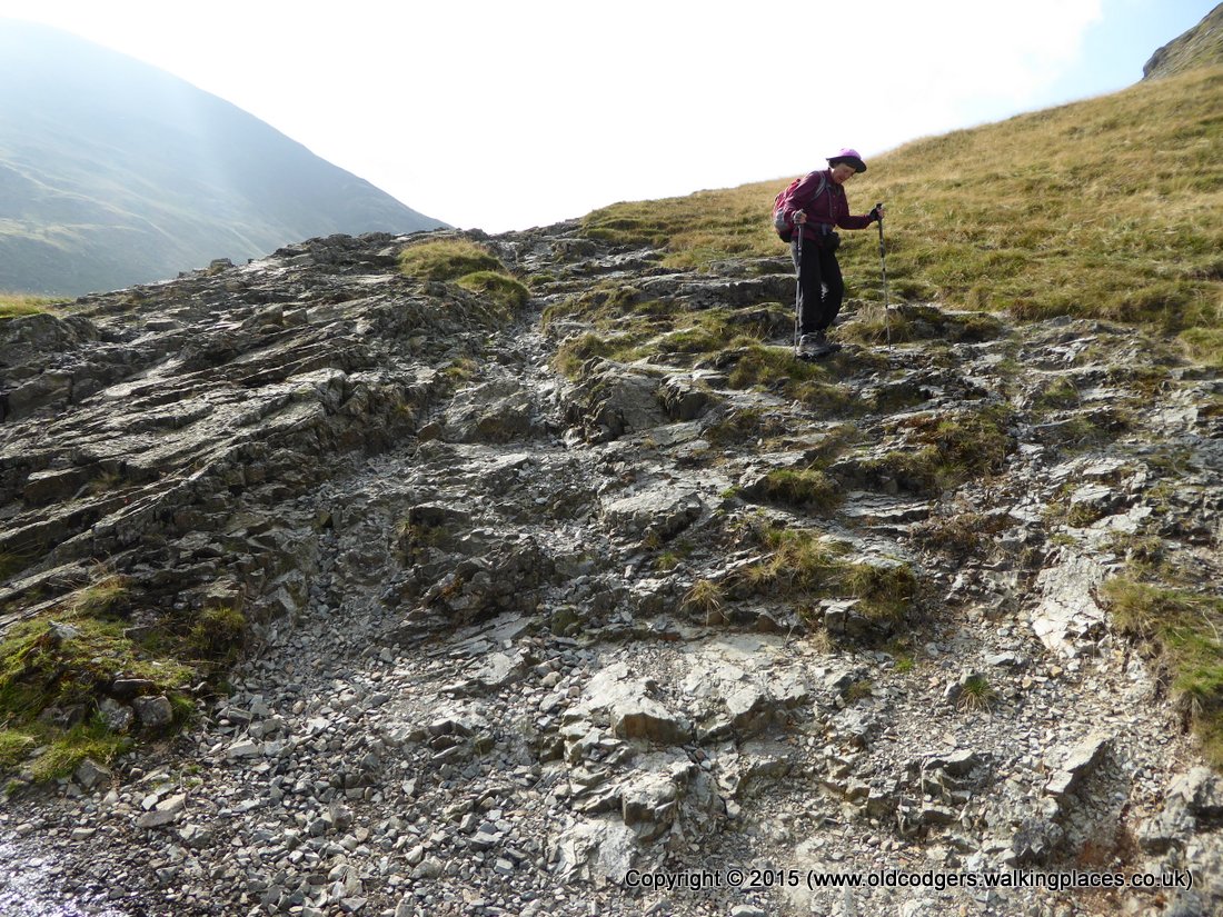 For a change from our 2010 walk, we took the right hand route around Great Tongue following the valley of Tongue Gill. Rather than the constant, wearing climb of the left hand route, we had a series of short steep climbs followed by relatively level sections to catch our breath, until we came to the steeper, stepped climb at the end of the valley. Compared to the soft, grassy left hand route, we had a very rocky path that was rough in places and tough on our feet. We didn't have the views over Grasmere seen from the left hand route, but we did have the sound of waterfalls all the way up the valley. Both routes have their charms and challenges.