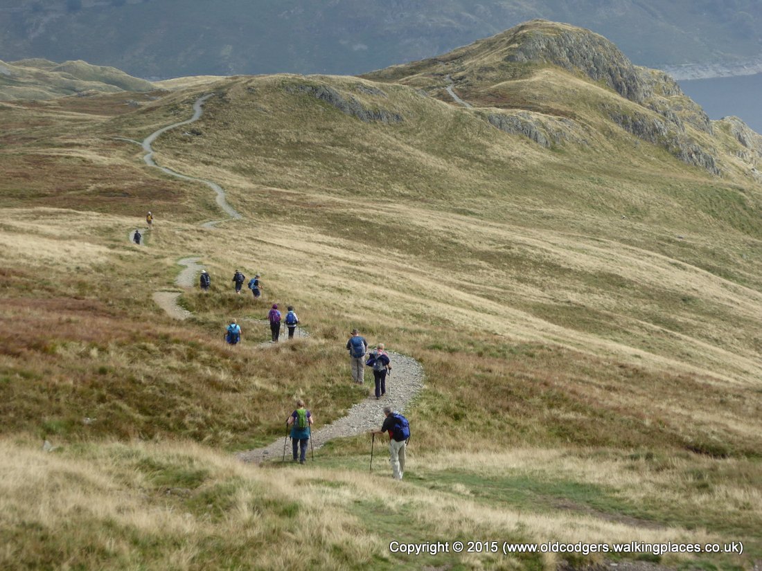 Past the tarn and Satura Crag, we stopped at 11am on a rock shelf for morning tea. From this vantage point we could watch people climbing up from Hayeswater, and we had a clear view of Rest Dodd, an unplanned detour on our 2010 C2C. Once we reached the saddle below Rest Dodd we understood how we had taken the wrong path in 2010, for the same reason as the four at Boredale Hause – the distinct path is not the C2C path. This time we were aware of the potential error and headed for the Knott. We stopped for a chat with a couple of Hartsopp residents on one of their regular jaunts to Hayeswater then up to Angle Tarn and back home – how wonderful to be able to do such a walk from the doorstep.